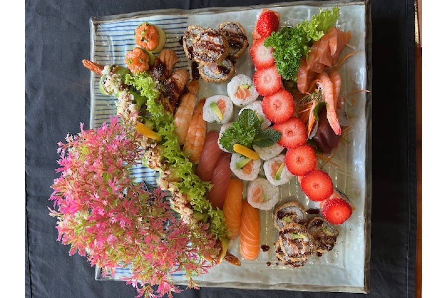 concombre,avocat,cheese,enroulé avec saumon et fraises